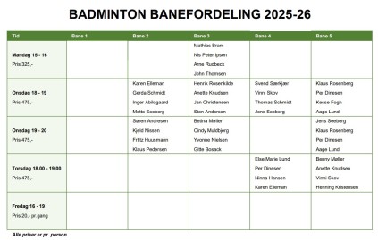 Herunder finder du banefordelingen for de fem badmintonbaner i Nustrup Hallen.